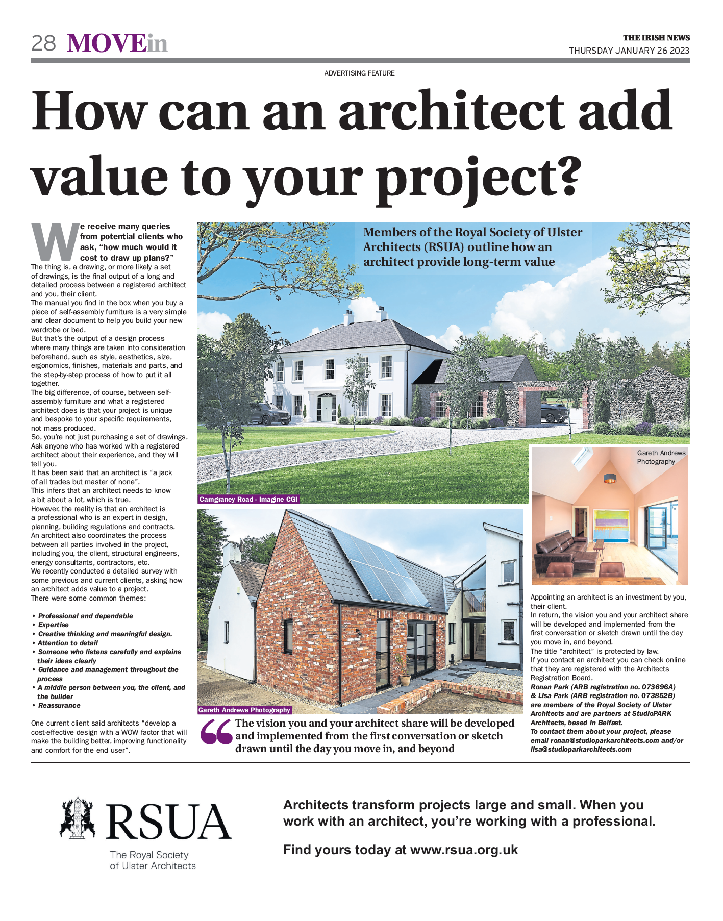 Ronan Park (ARB registration no. 073696A) & Lisa Park (ARB registration no. 073852B) are partners at StudioPARK Architects, based in Belfast. To contact them about your project, please email ronan@studioparkarchitects.com and / or lisa@studioparkarchitects.com