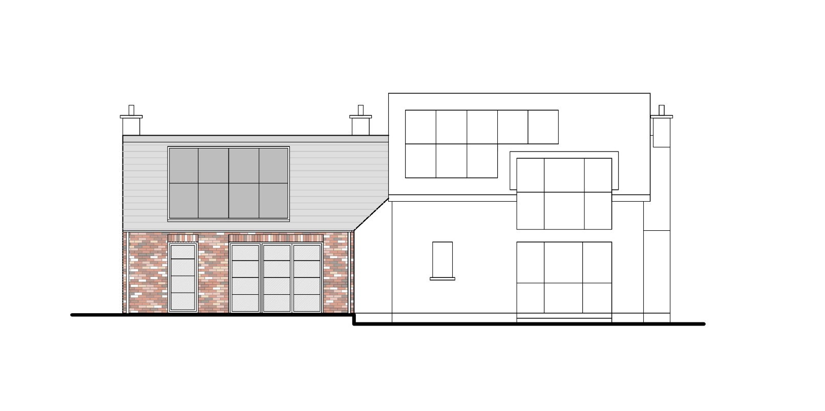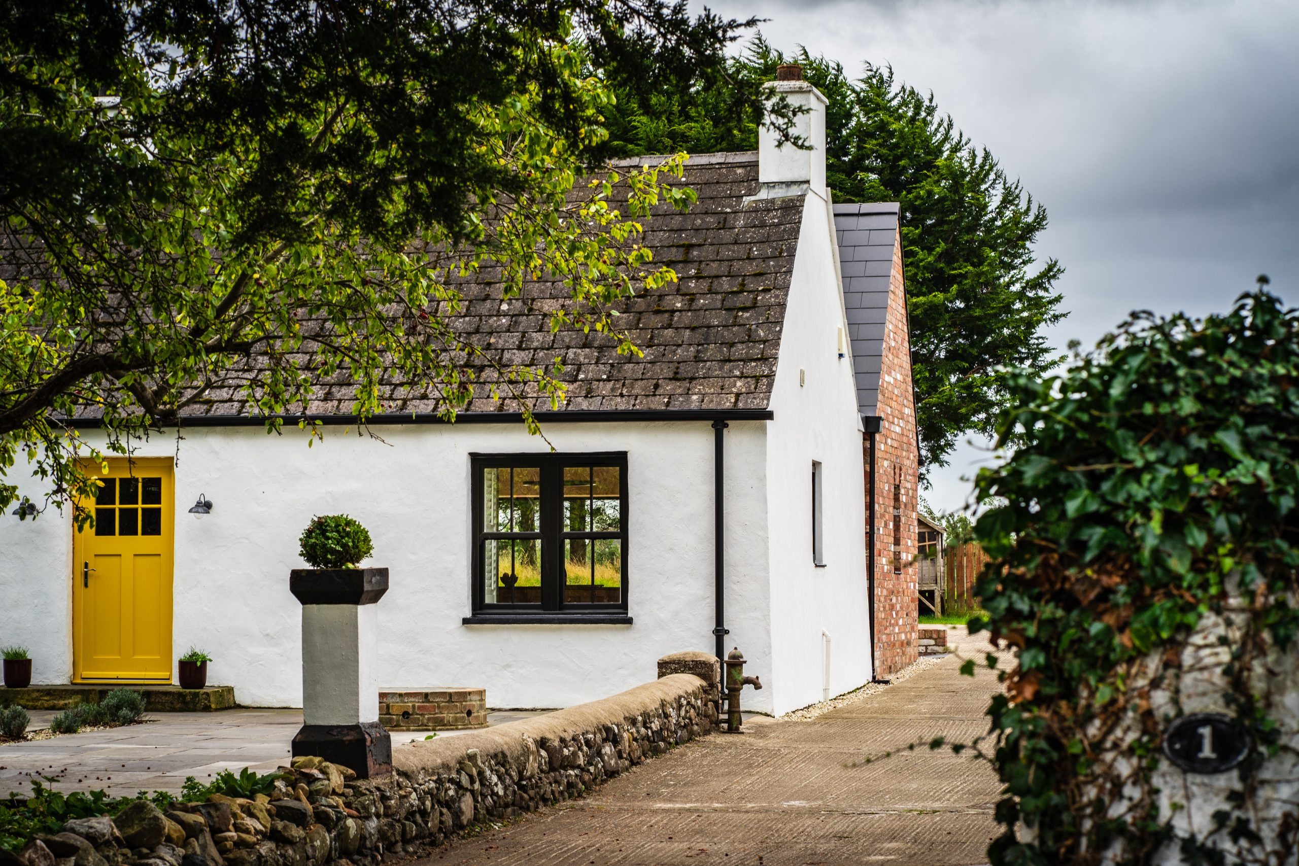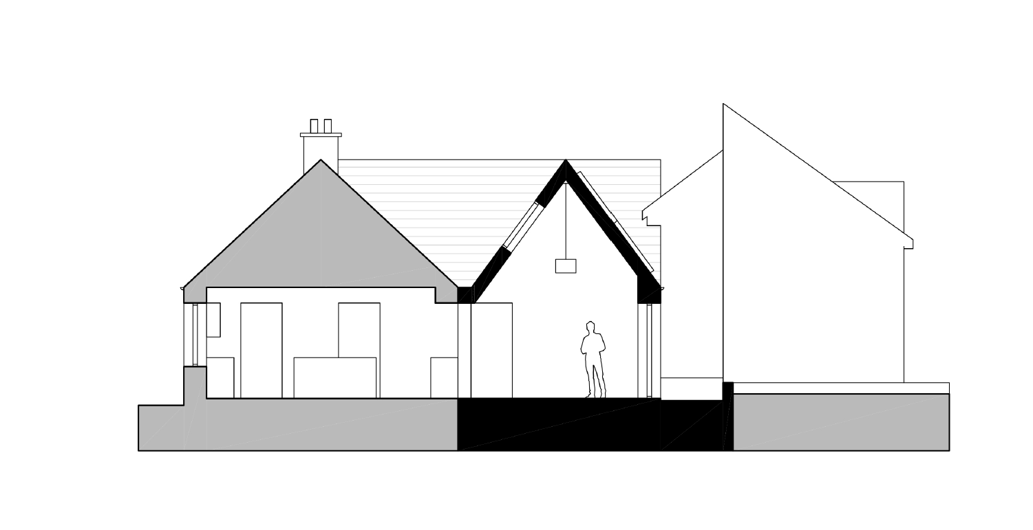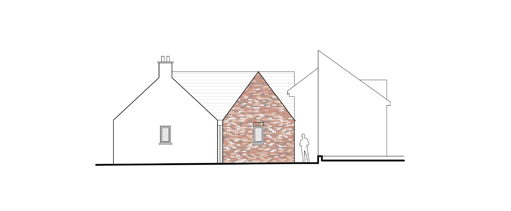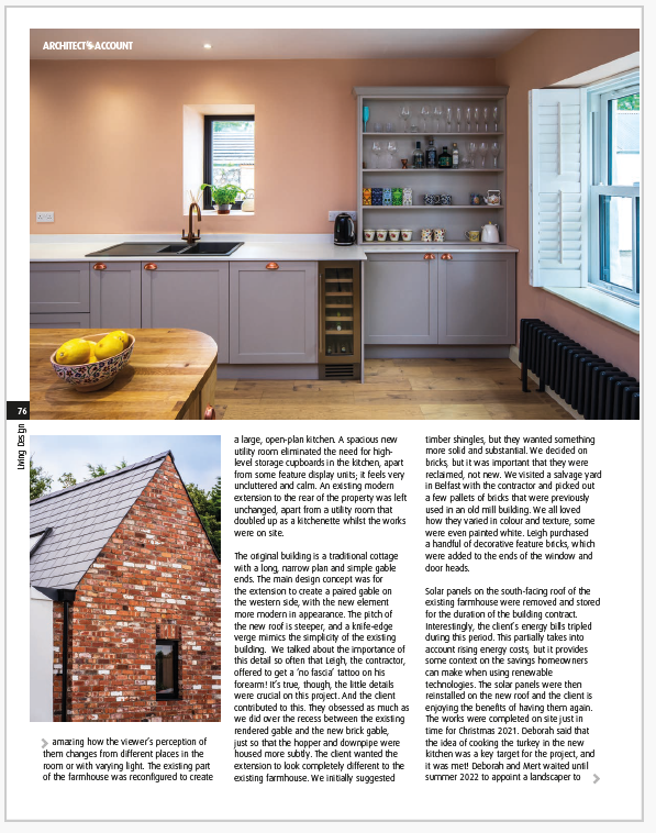 The original building is a traditional cottage with a long, narrow plan and simple gable ends. The main design concept was for the extension to create a paired gable on the western side, with the new element more modern in appearance. The pitch of the new roof is steeper, and a knife-edge verge mimics the simplicity of the existing. We talked about the importance of this detail so often that Leigh the contractor offered to get a ‘no fascia’ tattoo on his forearm! It’s true though, the little details were crucial on this project. And the client contributed to this. They obsessed as much as we did over the recess between the existing rendered gable and the new brick gable, just so that the hopper and downpipe were housed more subtly. The client wanted the extension to look completely different to the existing farmhouse. We initially suggested timber shingles, but they wanted something more solid and substantial. We decided on bricks, but it was important that they were reclaimed, not new. We visited a salvage yard in Belfast with the contractor and picked out a few pallets of bricks that were previously used in an old mill building. We all loved how they varied in colour and texture, some were even painted white. Leigh purchased a handful of decorative feature bricks, which were added to the ends of the window and door heads.