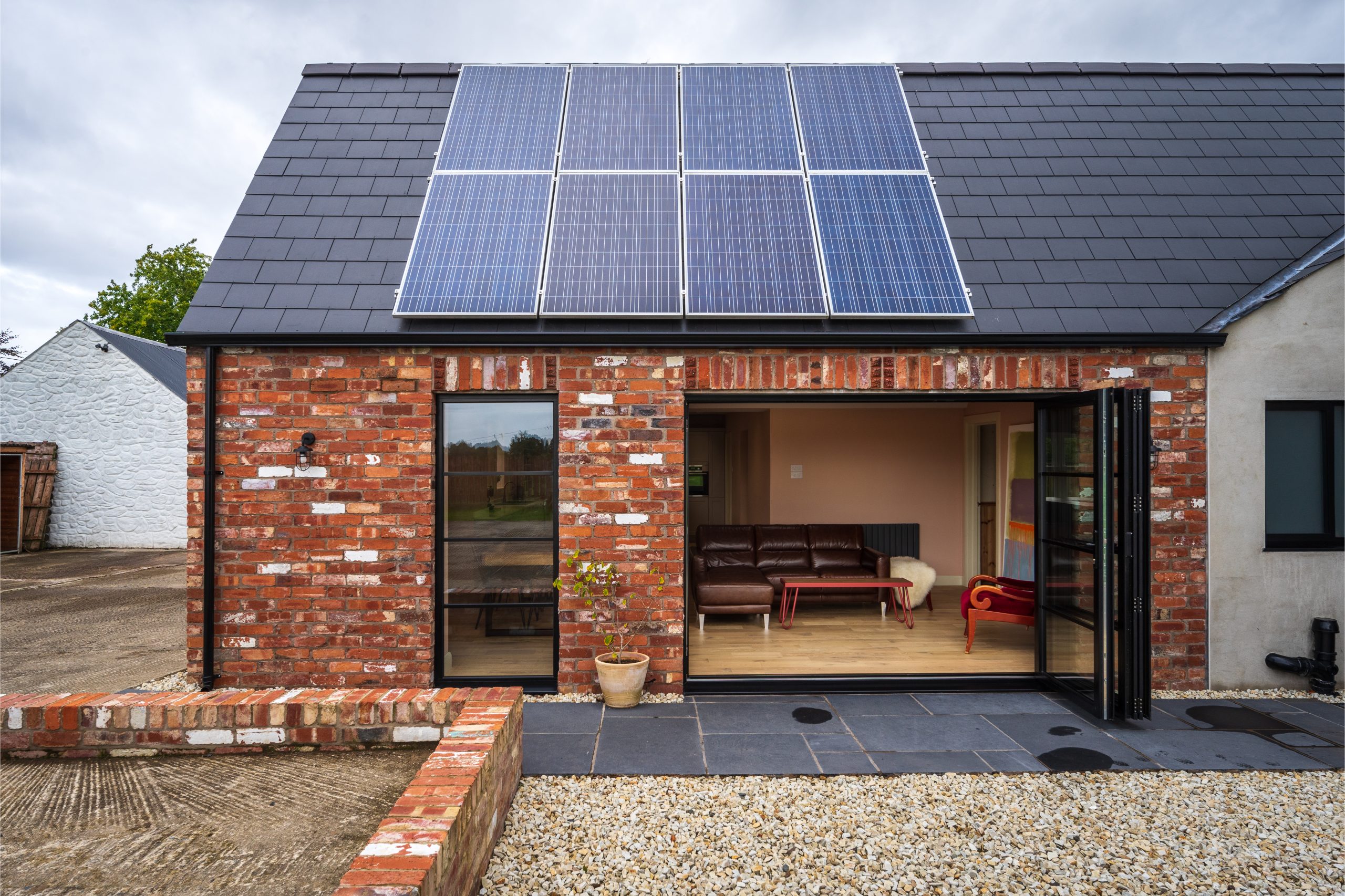 Solar panels on the south facing roof of the existing farmhouse were removed and stored for the duration of the building contract. Interestingly, the client’s energy bills tripled during this period. This partially takes into account rising energy costs, but it provides some context on the savings homeowners can make when using renewable technologies. The solar panels were then reinstalled on the new roof and the client is enjoying the benefits of having them again.
