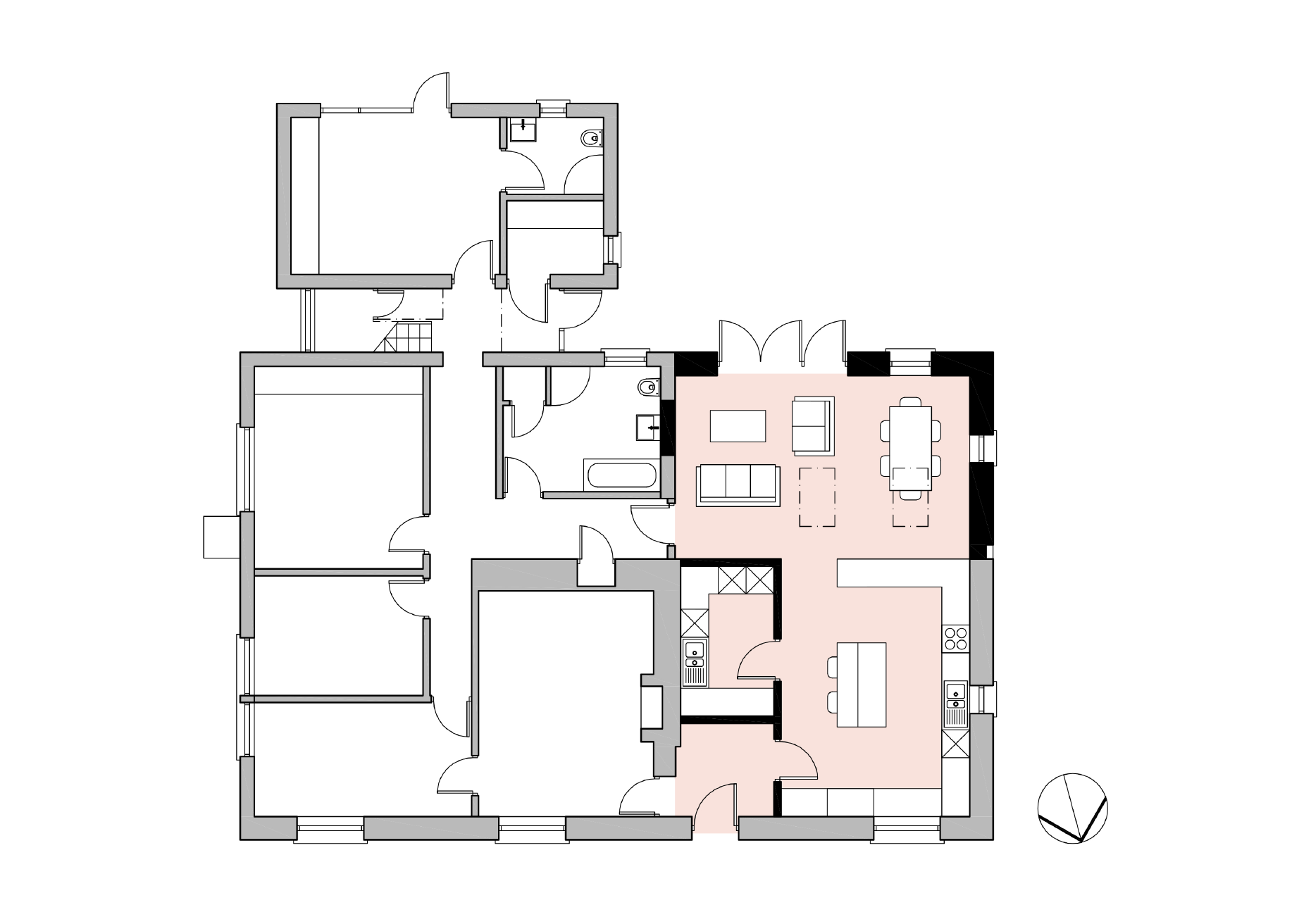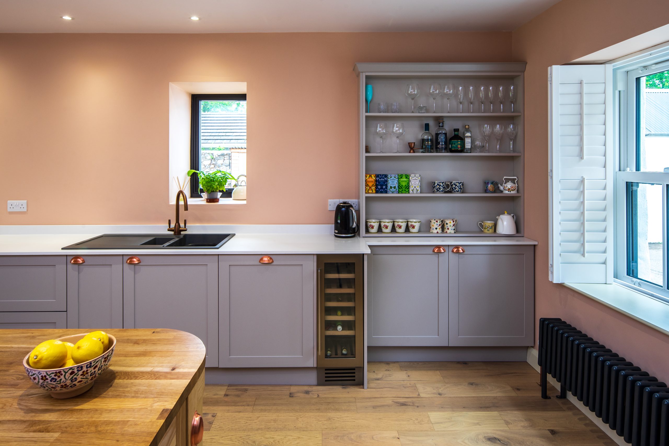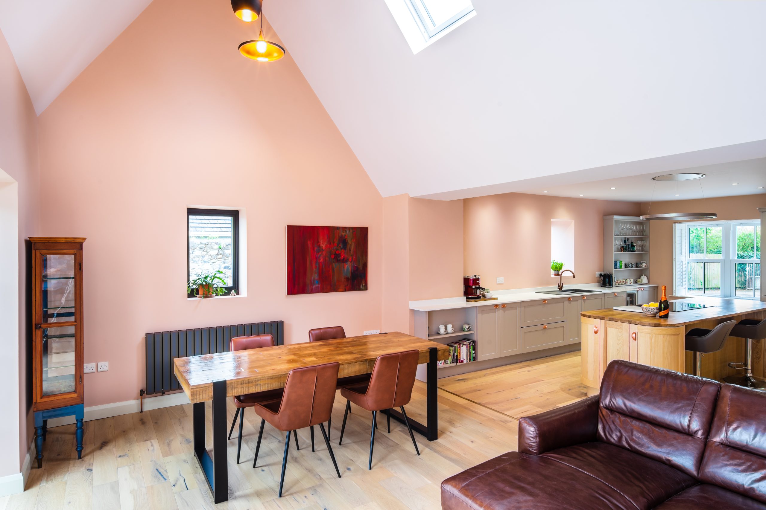 We proposed to remove a small existing rear entrance porch and build a new extension that squared-off the plan of the house. The focus of the new extension was a new living and dining space that had a strong connection to the south facing garden. A row of tall, mature trees lines the boundary and cattle can often be seen grazing in the fields beyond. Sliding / folding crittall style glazed doors open up the internal space to the patio, which is used for entertaining and barbeques. The vaulted ceiling above provides volume and an additional source of ambient light via north facing rooflights. Deborah’s beautiful paintings hang on the walls and it’s amazing how the viewer’s perception of them changes from different places in the room or with varying light. The existing part of the farmhouse was reconfigured to create a large, open plan kitchen. A spacious new utility room eliminated the need for high level storage cupboards in the kitchen, apart from some feature display units. It feels very uncluttered and calm. An existing modern extension to the rear of the property was left unchanged, apart from a utility room that doubled up as a kitchenette whilst the works were on site.