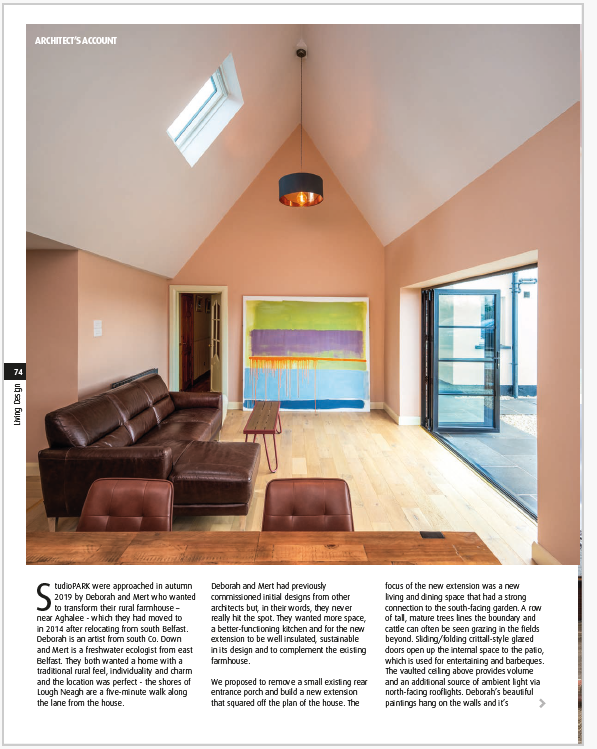StudioPARK were approached in autumn 2019 by Deborah and Mert, who wanted to transform their rural farmhouse near Aghalee. They moved there in 2014 after relocating from south Belfast. Deborah is an artist from south Co. Down and Mert is a freshwater ecologist from east Belfast. They both wanted a home with a traditional rural feel, individuality and charm and the location was perfect – the shores of Lough Neagh are a five-minute walk along the lane from the house.